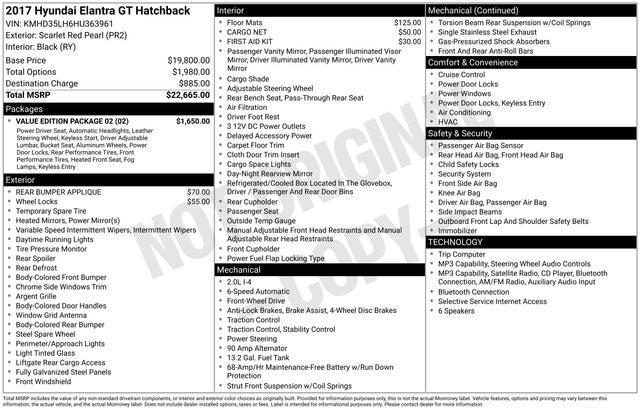 INCLUDES PREPAID MAINTENANCE, 17 x 7.0J Alloy Wheels, 6 Speakers, ABS brakes, Automatic Headlight Control, Brake assist, Delay-off headlights, Driver's Auto-Up Window, Dual front impact airbags, Dual front side impact airbags, Electronic Stability Control, Front Center Armrest, Front Fog Lights, Heated door mirrors, Heated Front Bucket Seats, Leather Seating Surfaces, Leather Wrapped Steering Wheel & Shift Knob, Occupant sensing airbag, Option Group 02, Overhead airbag, Power door mirrors, Power Driver's Seat w/Power Lumbar, Power windows, Proximity Key Entry w/Push Button Start, Radio: AM/FM/SiriusXM/CD/MP3 Audio System, Rear seat center armrest, Security system, Sliding Center Armrest, Speed control, Speed-sensing steering, Split folding rear seat, Sport-Tuned Suspension, Steering wheel mounted audio controls, Telescoping steering wheel, Tilt steering wheel, Traction control, Value Edition Package 02. 2017 Hyundai Elantra GT 4D Hatchback 2.0L DOHC 6-Speed Automatic with Shiftronic Scarlet Red Pearl