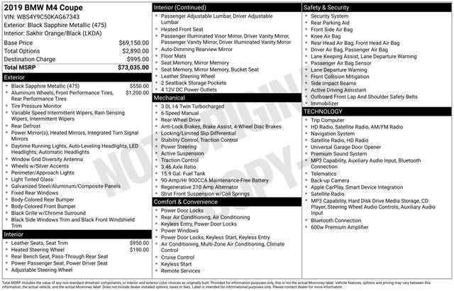 INCLUDES PREPAID MAINTENANCE, ABS brakes, Alloy wheels, Apple CarPlay Compatibility, Electronic Stability Control, Exterior Parking Camera Rear, Heated door mirrors, Heated Front Seats, Heated Steering Wheel, Low tire pressure warning, Lumbar Support, Navigation System, Power Front Seats, Steering wheel mounted audio controls, Traction control. Odometer is 21529 miles below market average! Black Sapphire Metallic 2019 BMW M4 RWD 6-Speed Manual 3.0L 6-Cylinder Turbocharged DOHC