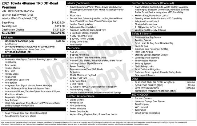 CLEAN CARFAX... NO ACCIDENTS, ONE OWNER, INCLUDES PREPAID MAINTENANCE, 4WD, Black/Graphite Artificial Leather, Black Roof Rails, Body Color Heated Mirrors, Garage Door Opener, Moonroof Package, Moonroof w/Tilt Up & Slide, Off Road Package, Off Road Premium Package w/Softex, Wireless Smart Entry Door Lock. Odometer is 3259 miles below market average! Super White 2021 Toyota 4Runner TRD Off-Road Premium 4WD 5-Speed Automatic with Overdrive 4.0L V6 SMPI DOHC