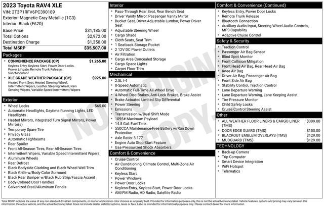 NEW TIRES, CLEAN CARFAX... NO ACCIDENTS, INCLUDES PREPAID MAINTENANCE, AND KOCH 33'S EXCLUSIVE UNLIMITED TIME/100000 MILE POWERTRAIN WARRANTY, NEW FRONT BRAKE PADS, AWD, Black Cloth, 3 Spoke Leather Heated Steering Wheel, Convenience Package, Front Door Smart Key System w/Push Button Start, Front Seat Heating, Rain Sensing Front Wipers, Tilt & Slide Moon Roof, XLE Grade Weather Package. Magnetic Gray Metallic 2023 Toyota RAV4 XLE AWD 8-Speed Automatic 2.5L 4-Cylinder DOHC Dual VVT-i