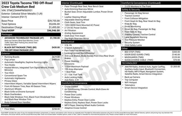 TOYOTA FACTORY CERTIFIED, NEW TIRES, ONE OWNER, INCLUDES PREPAID MAINTENANCE, 4WD, 120V/400W Deck Mounted AC Power, ABS brakes, Advanced Technology Package, Alloy wheels, Black Overfenders, Blind Spot Monitor w/Rear Cross Traffic Alert, Electronic Stability Control, Engine Immobilizer, Front dual zone A/C, Heated door mirrors, Illuminated entry, Low tire pressure warning, Mesh Front Grille, Multi Terrain Monitor w/Camera, Power Sliding Rear Window w/Privacy Glass, Rear Parking Assist Sonar, Remote keyless entry, Traction control, TRD Off Road Package. Celestial Silver Metallic 2023 Toyota Tacoma TRD Off-Road V6 4WD 6-Speed 3.5L V6
