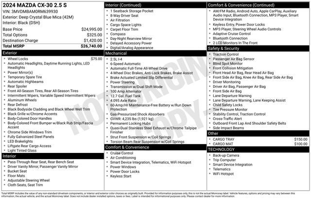 CLEAN CARFAX... NO ACCIDENTS, ONE OWNER, INCLUDES PREPAID MAINTENANCE. Deep Crystal Blue Mica 2024 Mazda CX-30 2.5 S AWD 6-Speed Automatic SKYACTIV® 2.5L 4-Cylinder DOHC 16V