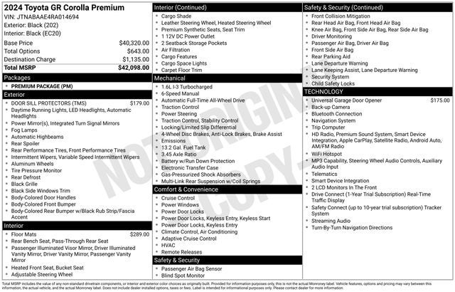 CLEAN CARFAX... NO ACCIDENTS, ONE OWNER, INCLUDES PREPAID MAINTENANCE. Odometer is 5591 miles below market average! Black 2024 Toyota GR Corolla Core AWD 6-Speed Manual 1.6L I3 PDI Turbocharged DOHC 12V LEV3-ULEV70 300hp