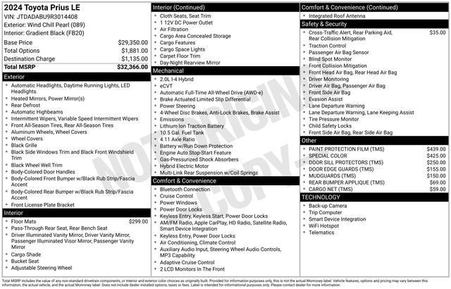 CLEAN CARFAX... NO ACCIDENTS, ONE OWNER, INCLUDES PREPAID MAINTENANCE, 2.0L 4-Cylinder DOHC 16V VVT. Pearl 2024 Toyota Prius LE AWD Continuously Variable (ECVT) 2.0L 4-Cylinder DOHC 16V VVT