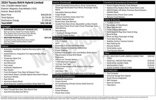 CLEAN CARFAX... NO ACCIDENTS, ONE OWNER, INCLUDES PREPAID MAINTENANCE, 2.5L 4-Cylinder, Advanced Technology Package, Front Seat Heating/Ventilation, Heated 3-Spoke Leather Steering Wheel, Panoramic View Monitor, Qi-Compatible Wireless Smartphone Charging, Rear Outboard Seat Heating, Smart Key System w/Push Button Start, Weather Package. Odometer is 14487 miles below market average! Magnetic Gray Metallic 2024 Toyota RAV4 Hybrid Limited AWD eCVT 2.5L 4-Cylinder