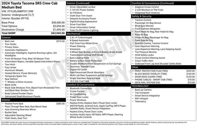 CLEAN CARFAX... NO ACCIDENTS, ONE OWNER, INCLUDES PREPAID MAINTENANCE, 4WD. Underground 2024 Toyota Tacoma SR5 4WD 8-Speed Automatic 2.4L 4-Cylinder