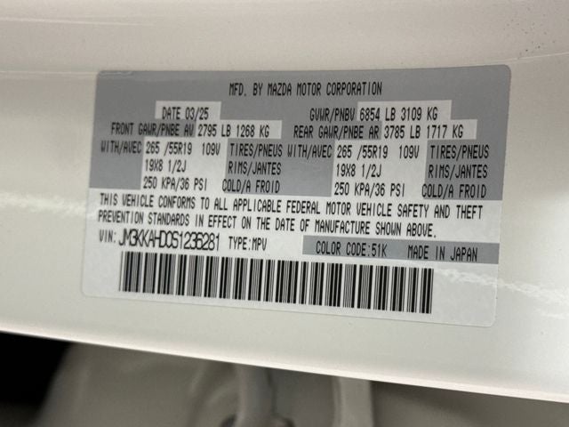 ***MAZDA CERTIFIED Pre-Owned Vehicle, INCLUDES PREPAID MAINTENANCE, ***CLEAN CARFAX, Apple Carplay / Android Auto, 3rd row seats: bench, 8 Speakers, AppLink/Apple CarPlay and Android Auto, Auto High-beam Headlights, Automatic temperature control, Brake assist, Delay-off headlights, Dual front impact airbags, Dual front side impact airbags, Electronic Stability Control, Exterior Parking Camera Rear, Front dual zone A/C, Heated door mirrors, Infotainment System Voice Command, Knee airbag, Leather steering wheel, Leatherette Seat Trim, Low tire pressure warning, Occupant sensing airbag, Overhead airbag, Power door mirrors, Power driver seat, Power Liftgate, Radio: AM/FM w/HD/8-Speaker Sound System, Rear seat center armrest, SMS Text Msg Audio Delivery & Reply, Speed control, Speed-sensing steering, Split folding rear seat, Steering wheel mounted audio controls, Traction control, Turn signal indicator mirrors, Wheels: 19 x 8.5J Aluminum Alloy. The Mazda Certified Pre-Owned Vehicle Program takes the risk out of the used car buying experience. Driving a Mazda Certified Pre-Owned Vehicle means driving with knowledge and confidence that the used Mazda vehicle you purchase is protected by the following: A manufacturer-backed 7 year/100,000 mile Limited Powertrain Warranty* A manufacturer-backed 12 month/12,000 mile Additional Limited Warranty** Zero deductible for covered repairs A rigorous 160-Point vehicle inspection process Vehicle History Report on every vehicle 24 Hour Roadside Assistance Mazda now offers optional Mazda Extended Protection Plan (or MEPP) TotalCare coverage for Certified Pre-Owned vehicles! Think of this benefit as enhanced coverage to your certified pre-owned vehicle, making a great ownership experience even better. In addition to what your Mazda Certified Pre-Owned warranty covers, you will receive the following coverage enhancements with your MEPP Certified Pre-Owned vehicle Wrap*: Air Conditioning Suspension (Front/Rear) Steering Instrument Cluster (i.E. Speedometer) Radios, DVDs, Amplifier, Navigation System Fuel System Heating Cooling System Braking System Electrical System High-Tech/Convenience Group Reimbursement for the replacement of covered tires and wheels damaged by road hazard ($0 deductible for tires and wheels). Reimbursement for food and lodging. Up to $100 per day for up to 3 days if your vehicle needs a covered repair more than 50 miles from home. 2025 Mazda CX-90 3.3 Turbo Select 4D Sport Utility I6 Turbo 8-Speed Automatic Rhodium White Premium